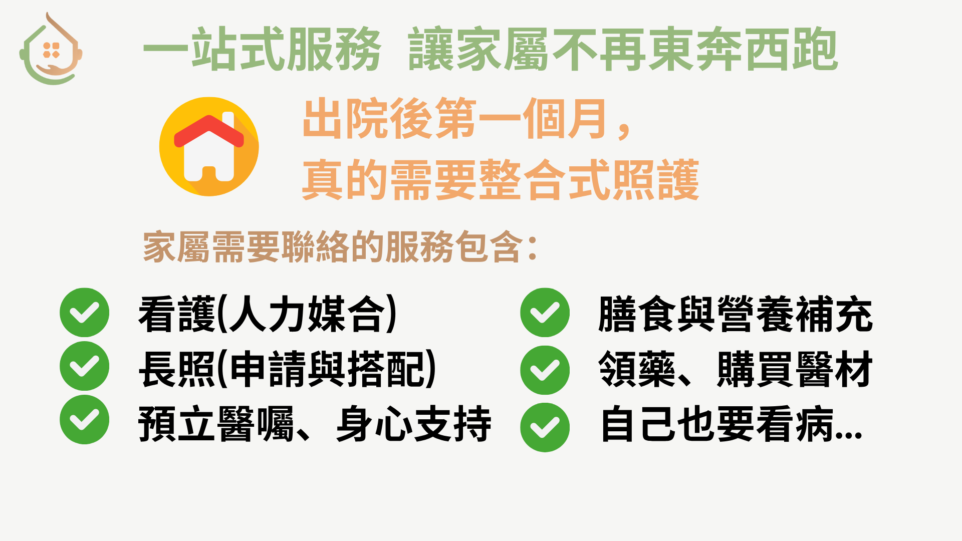 * 傷口護理的指導: 特別醫師請特別護士親自指導看護,確保其能正確處理傷口、觀察異常徵象,以便未來由看護接手主要照護工作。